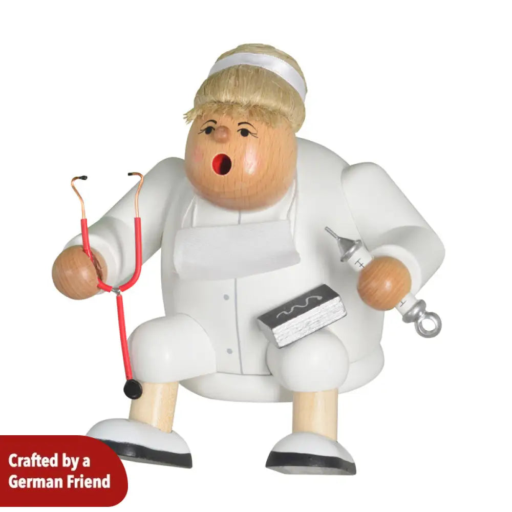 Dieser sitzende Räuchermännchen Arzt (weiblich) von unseren Freunden Kwo (Kunstgewerbe-Werkstätten Olbernhau GmbH) ist Teil ihrer Serie "Die Dicken".  Sie ist bereit, ihre nächste Patientin zu behandeln.