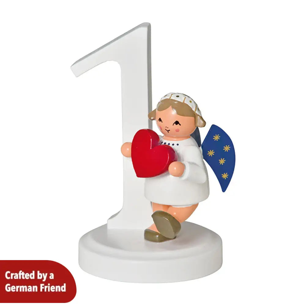 This charming handcrafted wooden angel figurine is a delightful decorative piece that radiates warmth and joy. The angel is dressed in a traditional white outfit, holding a vibrant red heart, symbolizing love and affection. The figurine is complemented by a large white number "1", making it a perfect choice for birthdays, anniversaries, or special milestones.