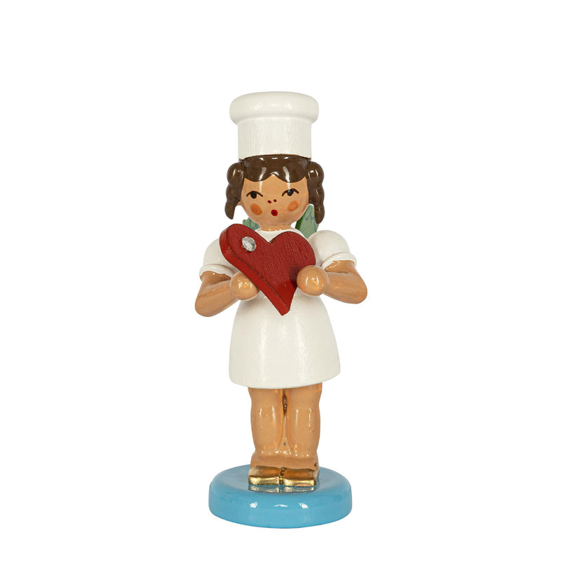 Dressed in a traditional white outfit and standing proudly on a gentle blue base, she reflects the timeless beauty of Erzgebirge folk art. The hand-painted details, from her rosy cheeks to the carefully shaped heart in her hands, give her a sense of personality and grace. The heart she holds symbolizes sincerity, care, and the joy of giving from the heart.