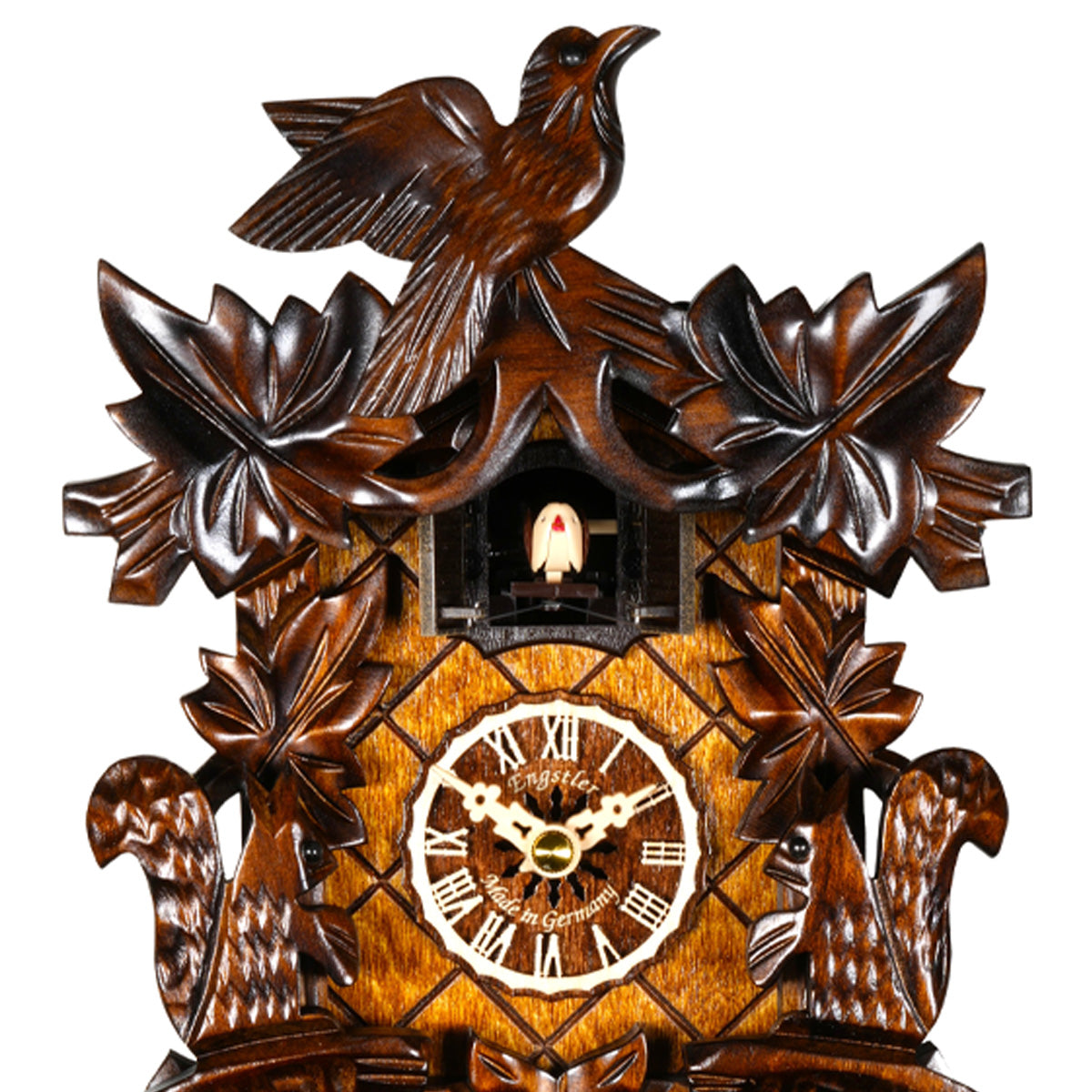 Hand-carved oak leaves surround the clock, symbolizing the beauty of nature, while two intricately detailed birds perch on either side, guardians of time and melody. At the top, a proud songbird spreads its wings, completing this timeless scene. Every hour, the cuckoo emerges, echoing the harmony of the woods with its gentle call.