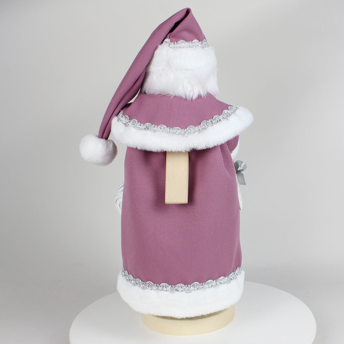 Wrapped in a soft rose-colored coat trimmed with plush white fur, Cozy Rose Santa stands gracefully, holding a beautifully wrapped present close to his heart. It’s a scene that feels deeply personal—Santa pausing to admire a gift before placing it under the tree, thinking of the smile it will bring on Christmas morning. In his other hand, he carries a shimmering silver ornament, as if he has just taken it from the box and is about to hang it with care.