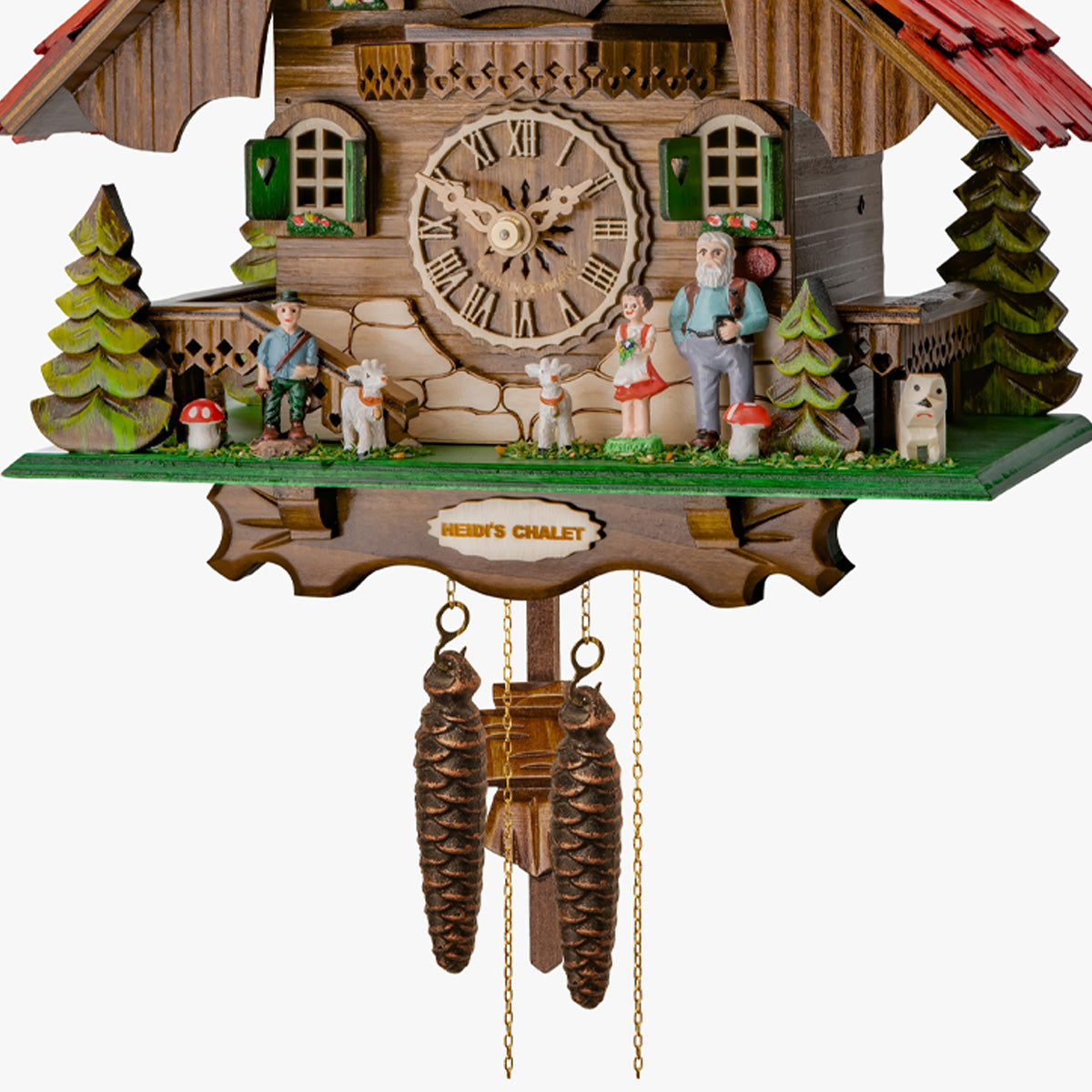 This beautifully handcrafted Heidi-themed cuckoo clock brings the charm of the Swiss Alps into your home. Modeled after a classic Alpine chalet, the design features intricate carvings, including Heidi, her grandfather, Peter, and the famous goats from the beloved story. The bright red roof and lush green surroundings enhance the fairytale-like appeal of this clock.
