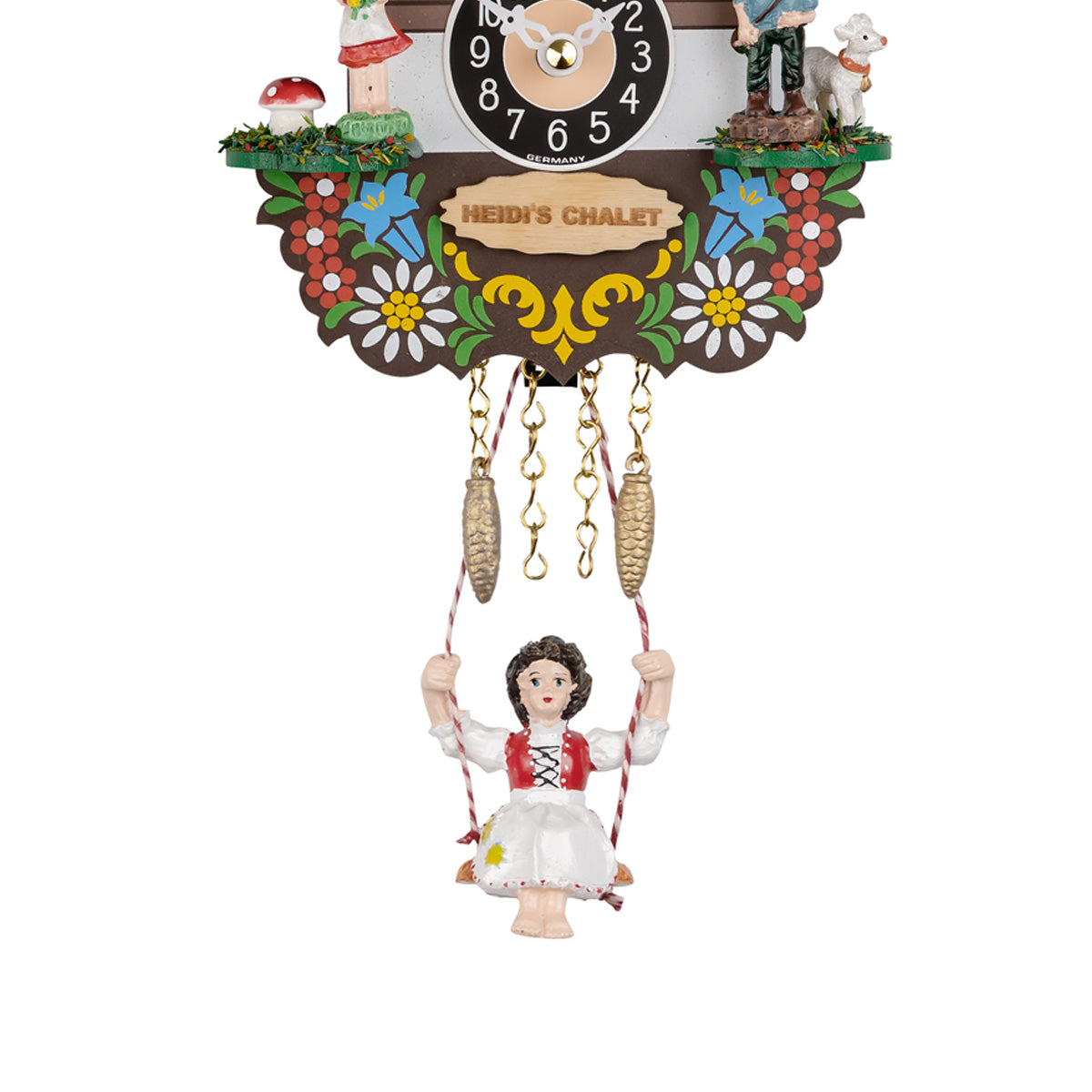 The beautifully crafted Black Forest house is adorned with intricate floral decorations and charming hand-painted figurines: Heidi in her traditional dress, Peter with his loyal goat, and a cheerful blue bird watching over the clock face. The scene truly comes to life with Heidi gently swinging back and forth, evoking the carefree joy of a summer day in the mountains.
