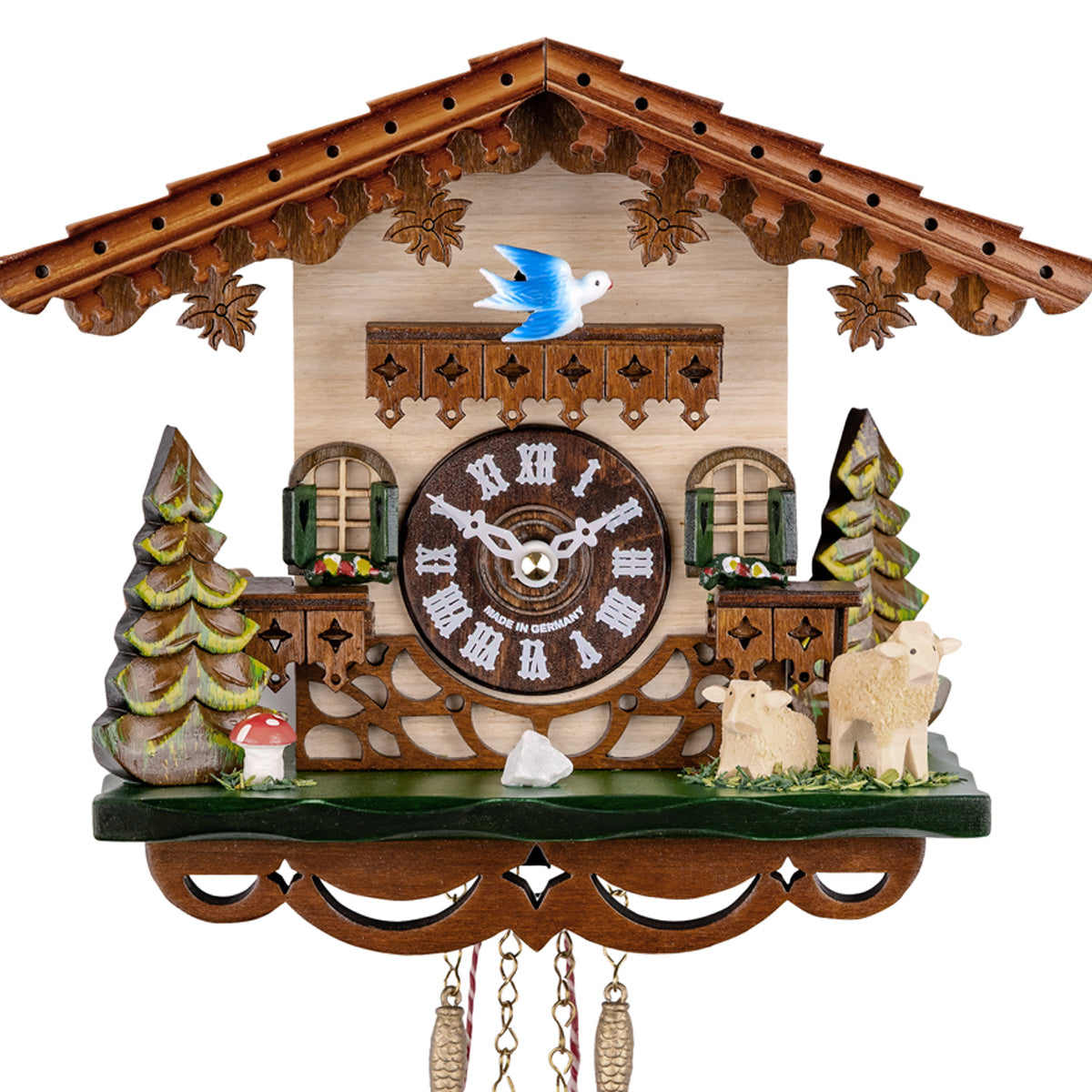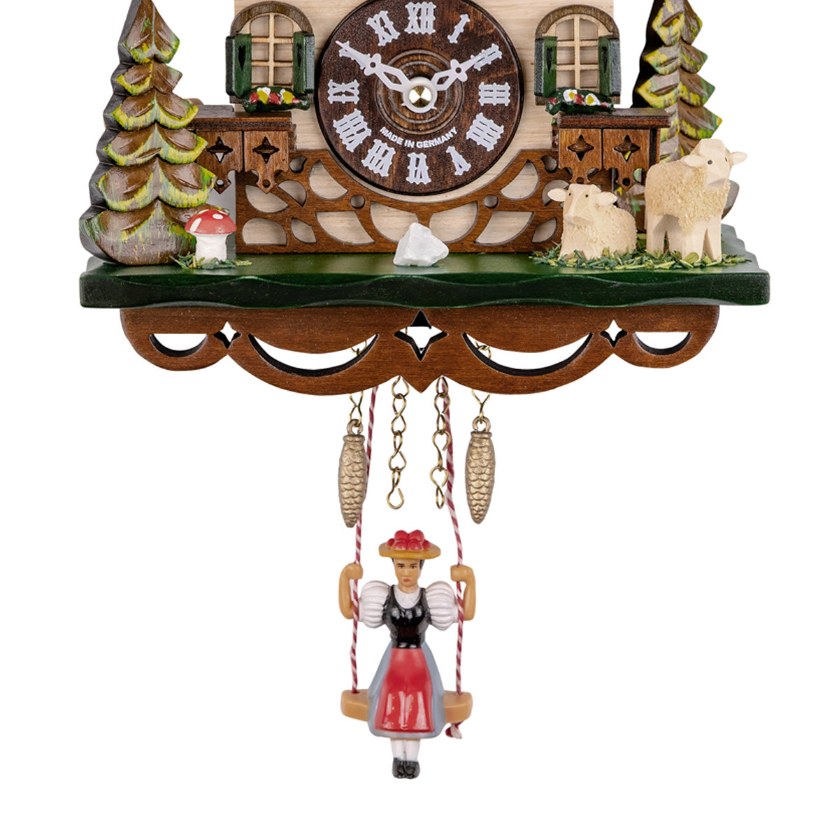 Bring the charm of a traditional Swiss chalet into your home with this beautifully crafted Engstler 174 SQ cuckoo clock. The delightful design features a classic Swiss-style house with intricate wooden details, lush greenery, and adorable sheep figures. A hand-painted blue cuckoo bird emerges on the hour, adding an authentic Black Forest touch. Below, a traditional swinging girl figurine moves in harmony with the clock, enhancing its charm.