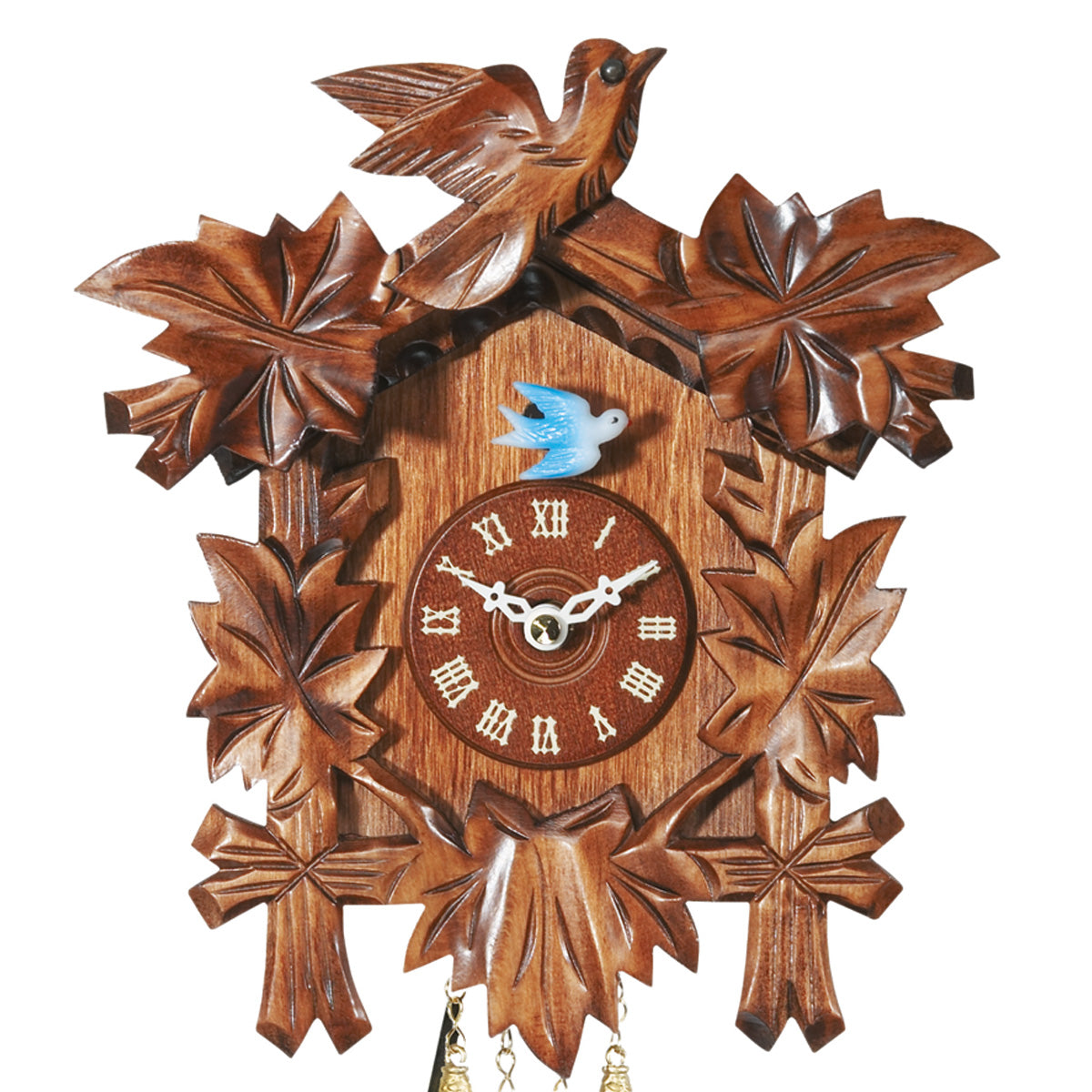 Experience the timeless charm of Black Forest craftsmanship with the Engstler 825 QP cuckoo clock. This beautifully hand-carved clock features an intricate leaf and bird design, evoking the classic cuckoo clock style. A hand-painted blue cuckoo bird appears on the hour, bringing a traditional touch to any home.