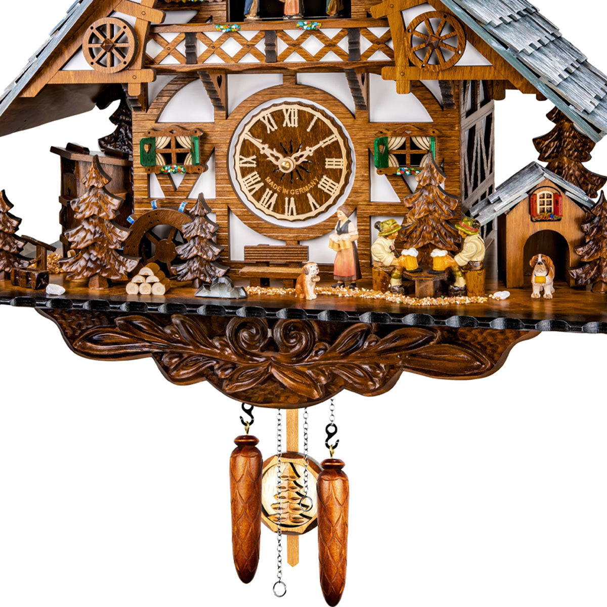 Every full hour, the cuckoo emerges to call, while figurines, including beer drinkers and dancers on the balcony, move in sync with the melodies played by the clock. Additional handcrafted elements such as trees, shutters, and a waterwheel add to its rustic charm.