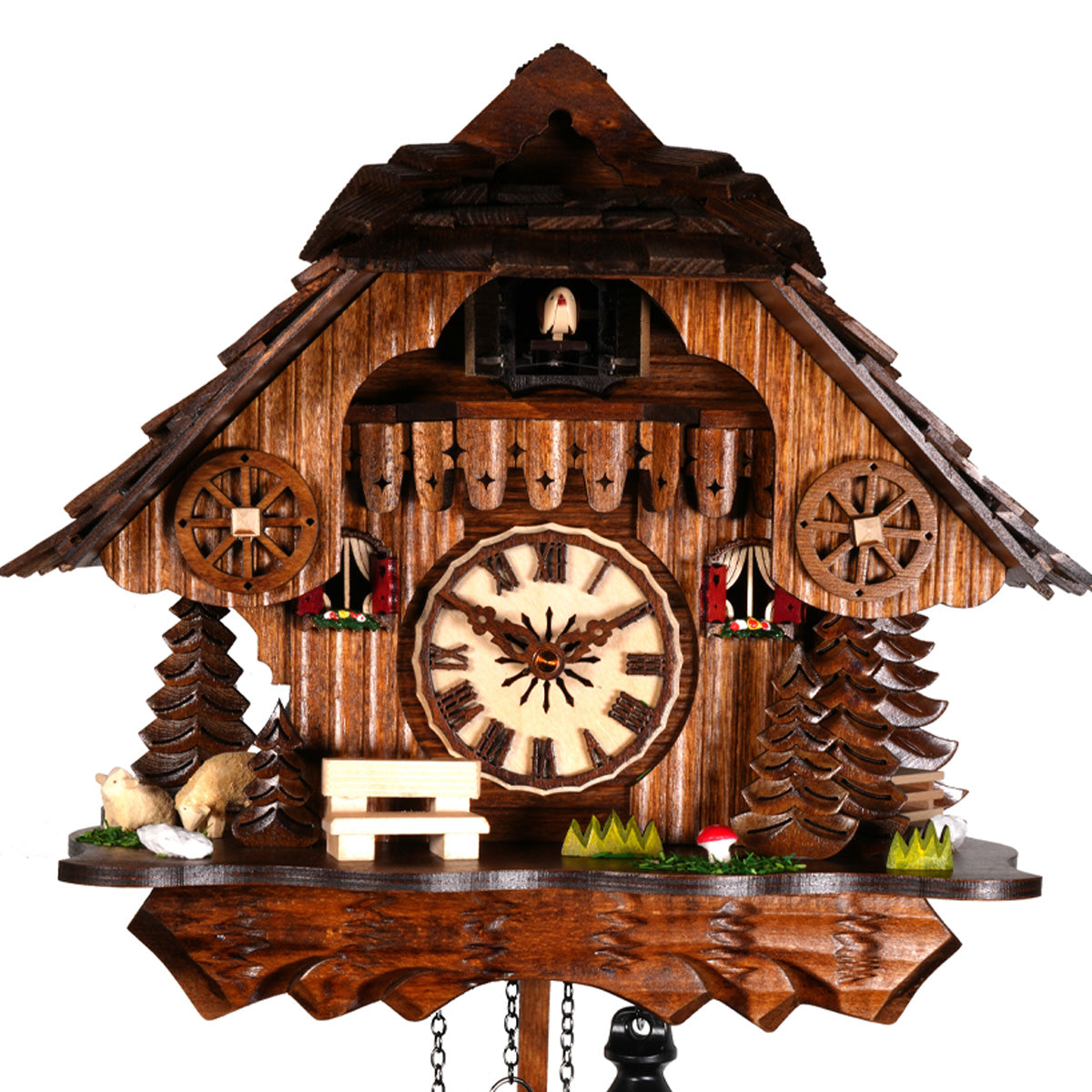 Carved from rich, dark wood, the chalet-style design features intricate details: delicate wooden shingles, charming window shutters, and finely sculpted trees that frame the scene. A peaceful alpine setting unfolds with grazing goats, a cozy wooden bench, and vibrant forest greenery. Above it all, the cuckoo peeks out from its little home, ready to announce the passing hours with its cheerful call.
