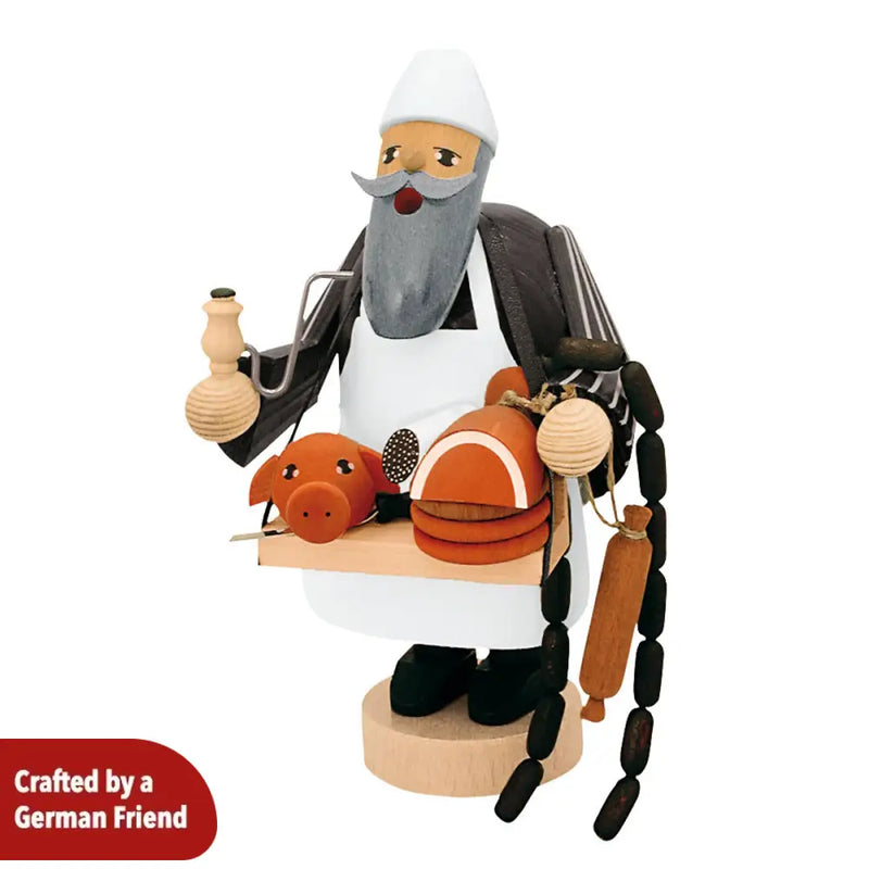 This charming "Butcher" incense smoker figure is a true tribute to traditional craftsmanship and the culinary delights of the meat trade. With his apron on and a display of sausages, hams, and a smiling pig, this figure brings the warmth and authenticity of a classic butcher shop to your home. Handcrafted with care, this smoker not only adds a unique decorative touch but also serves as a functional incense holder, filling your space with delightful aromas.