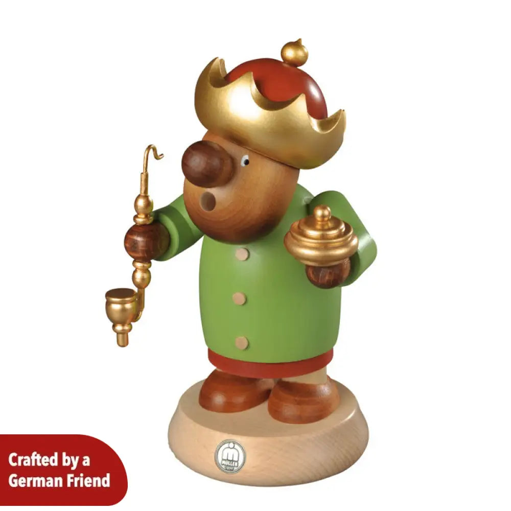 Nach dem der neue Stern am Nachthimmel aufgegangen ist, finden die drei heiligen Könige das Jesuskind in einer Krippe. Als Balthasar hält Muellerchen eine Schachtel mit Weihrauch für das Neugeborene in der einen und eine Pfeife in der anderen Hand. Er trägt einen grünen Mantel und eine Krone. Allein oder zusammen sind die drei heiligen Könige Räuchermännchen eine perfekte Ergänzung für Ihre Dekoration und Leuten die Weihnachtszeit ein.