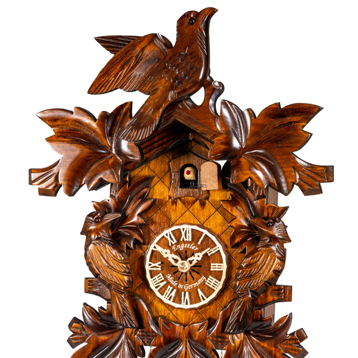 This traditional Black Forest cuckoo clock captivates with its beautifully carved three-bird design, blending a love for nature with exquisite craftsmanship. The detailed woodcarving features three birds and lush maple leaves, giving the case an elegant and classic charm.