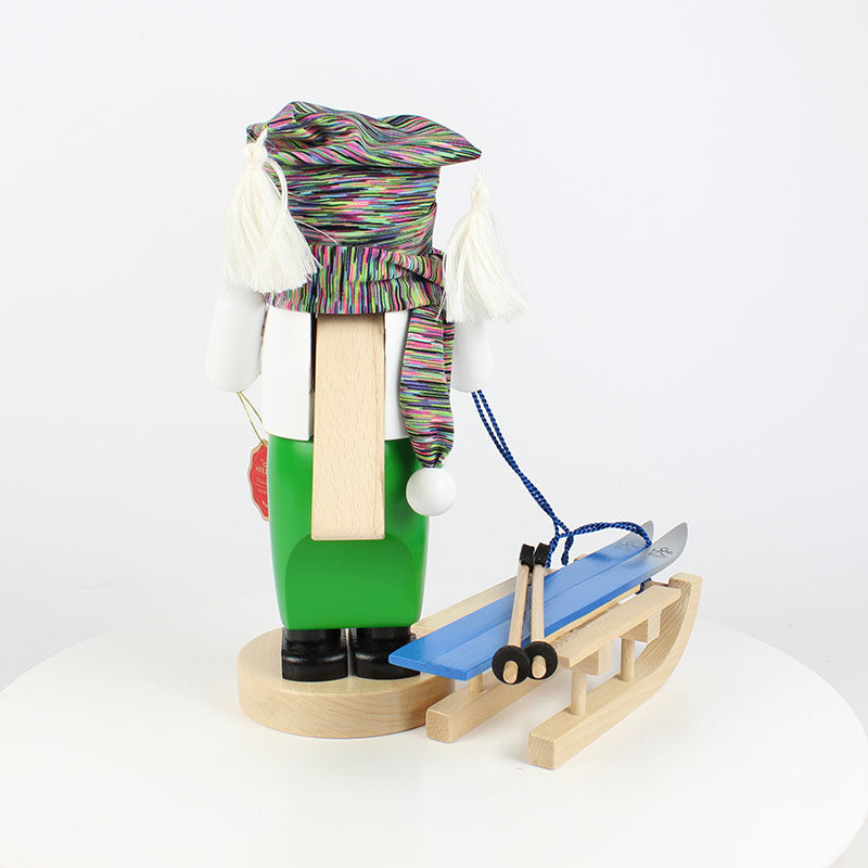 The Chubby Skier nutcracker is ready to embark on a snowy adventure. Wrapped in a warm scarf and a snug hat, this jolly figure is well-prepared for the chill of the alpine air. His white winter jacket, paired with striking green ski pants, gives him a vibrant and playful look, while his rosy cheeks and bright expression reflect the enthusiasm of someone ready to embrace the thrill of the slopes. One of the standout features of the Chubby Skier is the sleigh he carries along with his skis. In many snowy regions, a sleigh is both a practical means of transport and a source of entertainment.