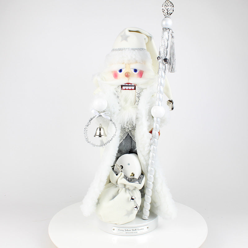Our Cozy Silver Bell Santa is the fourth nutcracker in our Cozy Santa series. Inspired by the arctic season, he shows himself as Santa Claus in a splendid festive manner. Wrapped in the finest robes in a silver look with white fur trim, it is an eye-opener for every collector. He proudly carries his bells in one hand and in the other one he holds his big stick with small bells hanging down so that you can hear him coming when he walks through the deep snow. The bells are his trademark and easily audible for everyone within his reach. But this is not the only thing that distinguishes our 47 cm tall Cozy Silver Bell Santa - it also has an integrated musical mechanism that plays the song "Silver Bells".