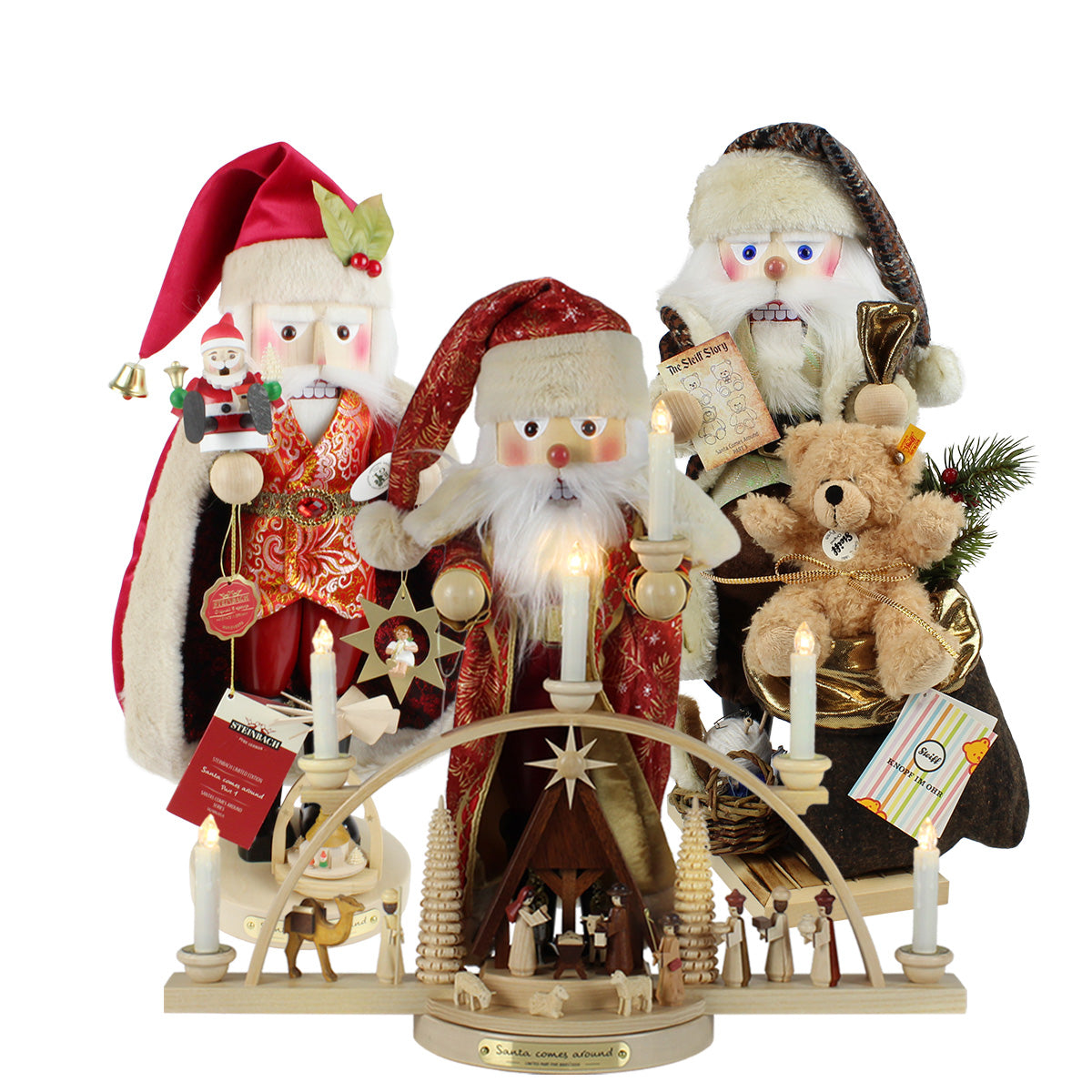 "SANTA COMES AROUND – Part 5" is the newest addition to the beloved collector’s series. Santa holds a glowing candle in his hand – a symbol of warmth, light, and festive cheer. In front of him stands an intricately crafted, electrically illuminated Schwibbogen (candle arch - with candles included) made by the renowned Müller Kleinkunst workshop in Seiffen, Germany. The nativity scene with carved trees, shepherds, and musicians brings depth and harmony to the display, making this piece a perfect continuation of the collection.