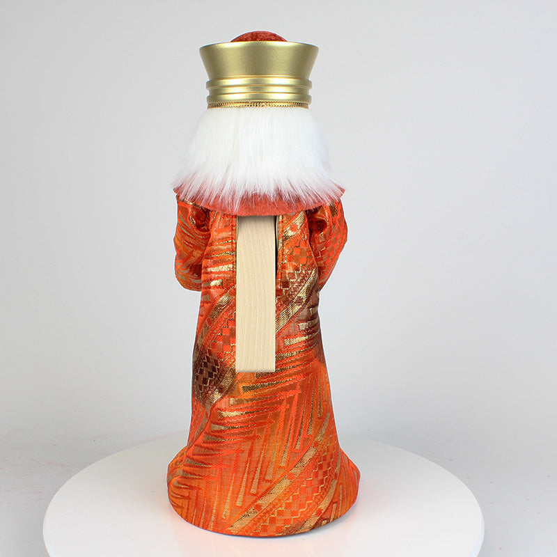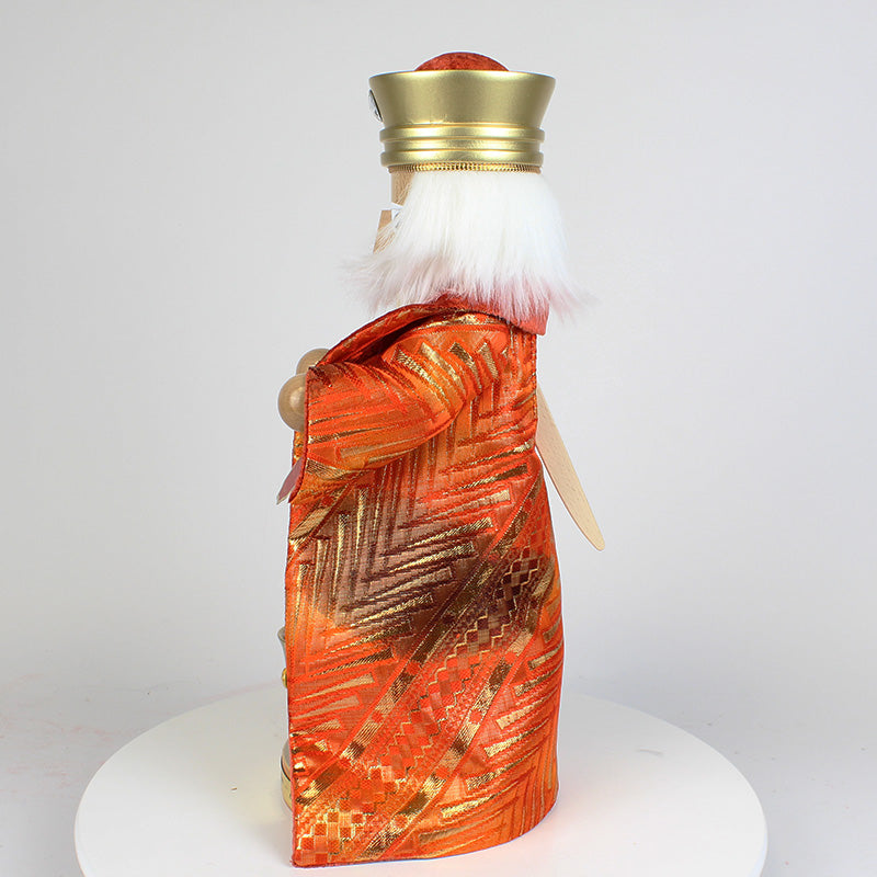 Our Melchior Nutcracker wears a golden garment paired with an orange velvet coat. His garment is decorated with a discreet pattern, which you will also find on the clothes of the other wise men. His coat is crested with a golden pattern that fits the look of Melchior perfectly. The overall picture emits an extravagant and exotic look, which will make this nutcracker a guaranteed eye catcher for your decoration. As an extra he has a golden urn next to his feet, which contains his gift for the newborn.