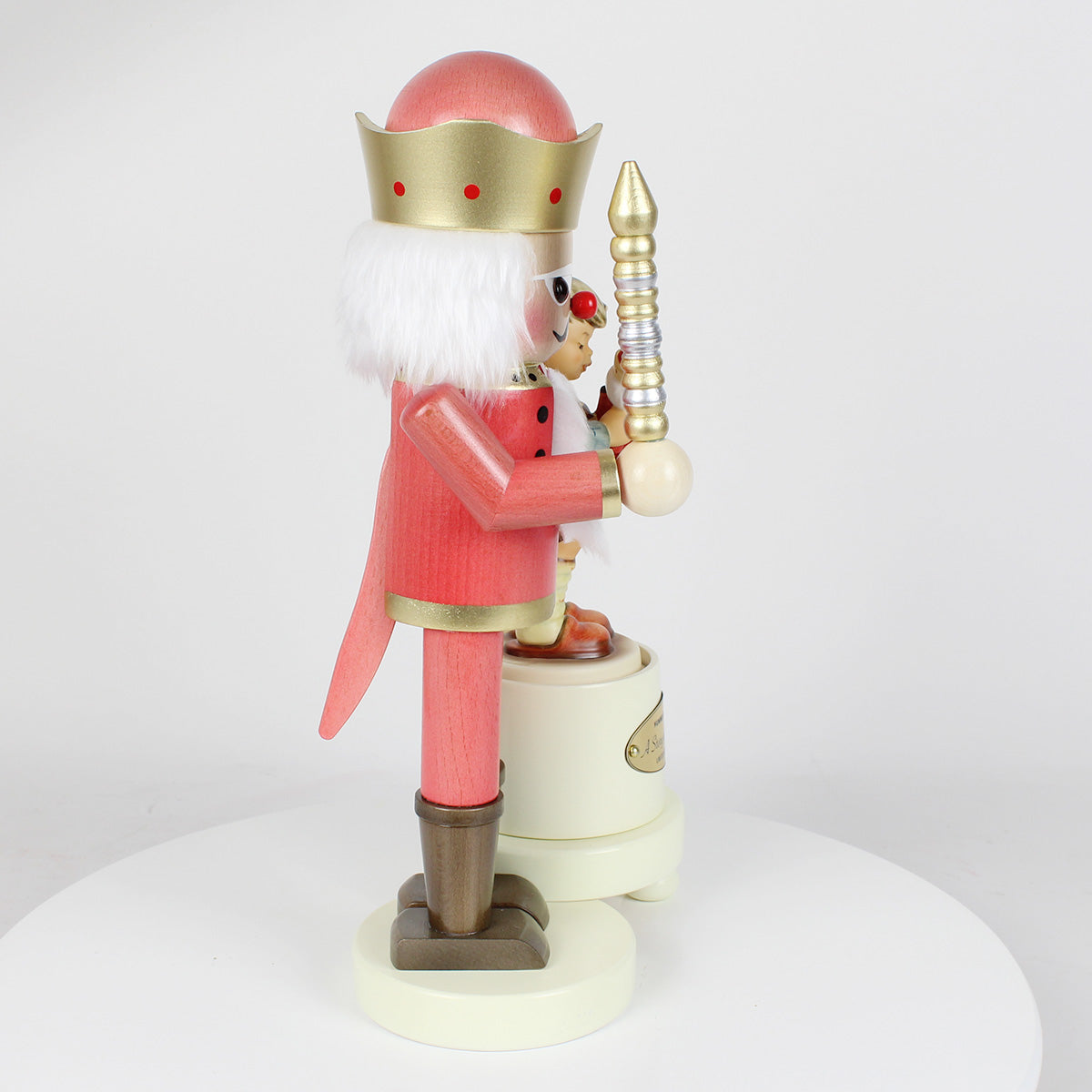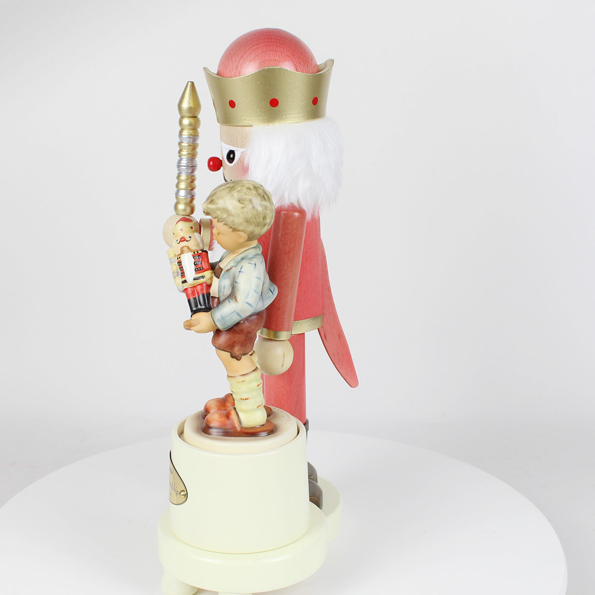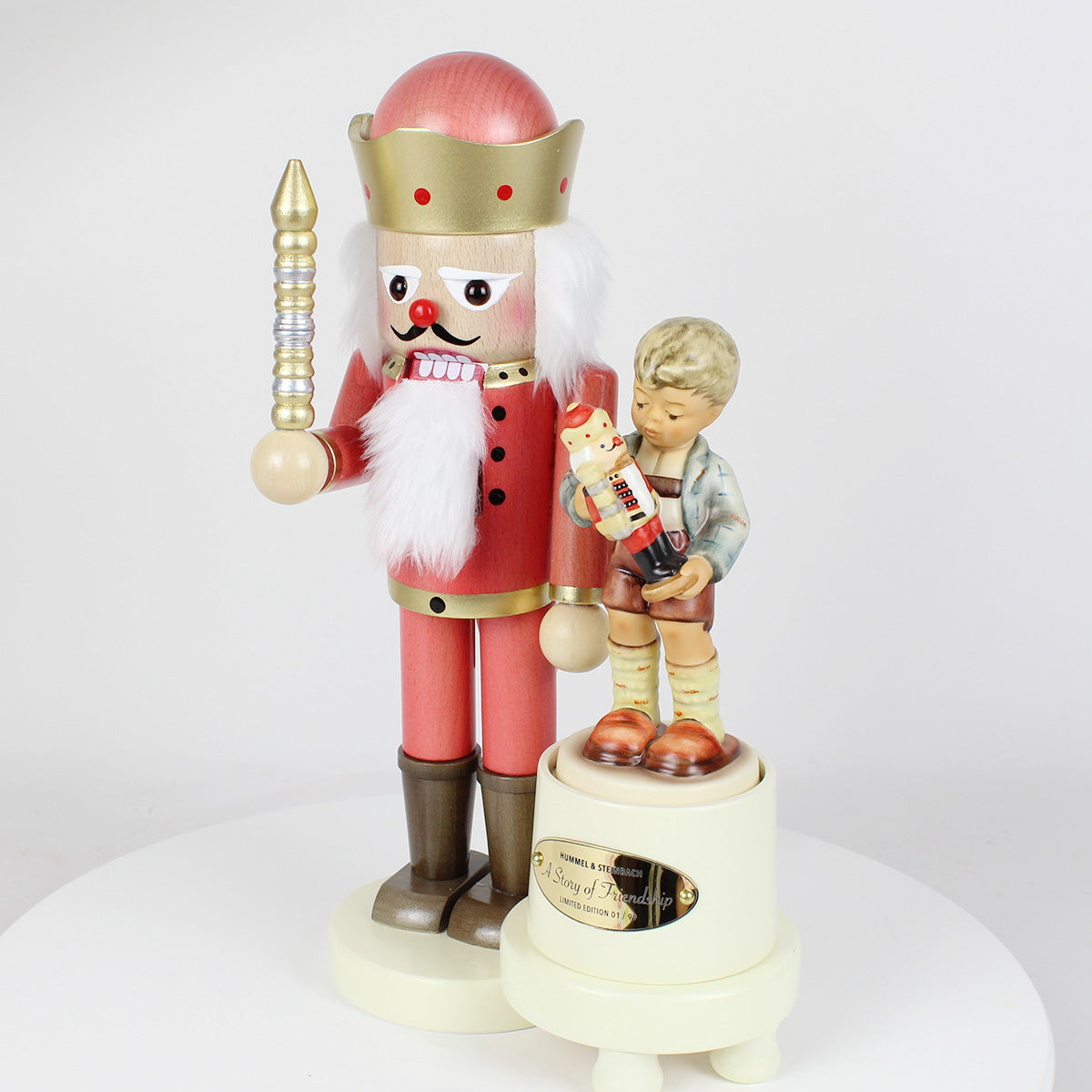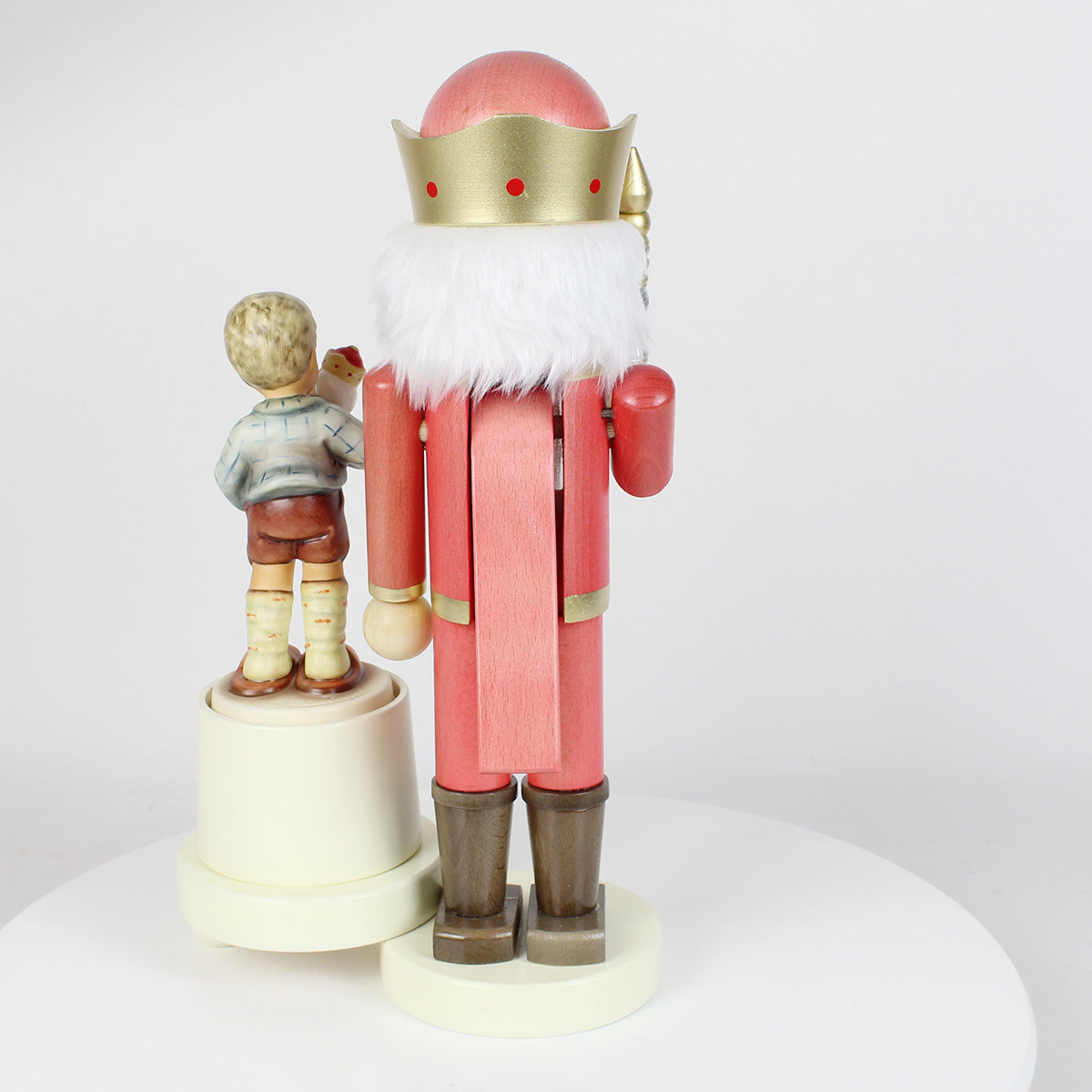 At its heart is the original Hummel porcelain boy, lovingly holding a miniature Steinbach nutcracker. To honor him, Steinbach’s master carvers have transformed that tiny figure into a full-sized wooden masterpiece – complete with red nose, golden crown, and scepter. Standing proudly beside the porcelain figurine, the nutcracker has stepped out of history and into the spotlight as the true main character.