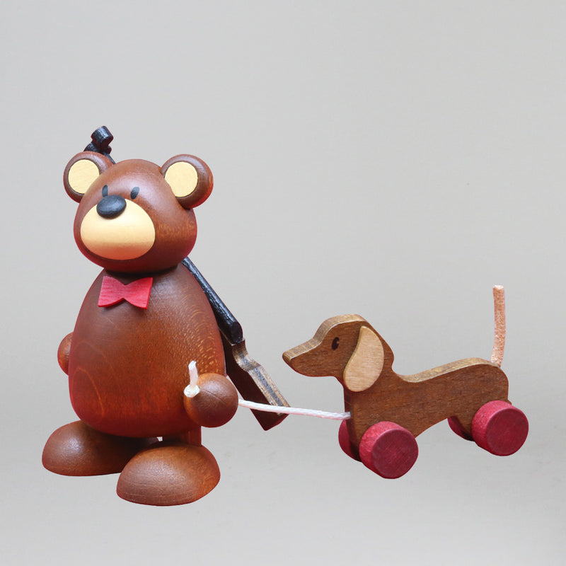 Dressed in his signature red bow tie and equipped with a hunter’s spirit, Bärnd sets off into the forest accompanied by his loyal dachshund. The small wooden dog on wheels follows faithfully at his side—ready for woodland walks, quiet mornings, and curious discoveries along the trail. Together, they tell a story of friendship, nature, and simple joys.