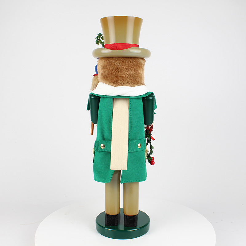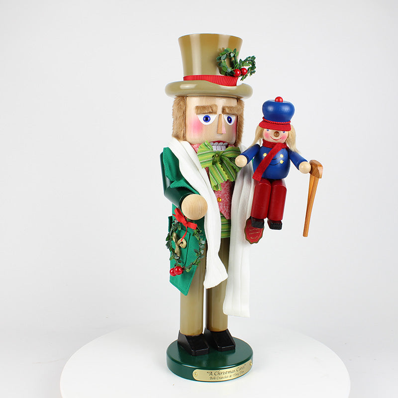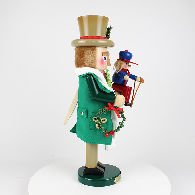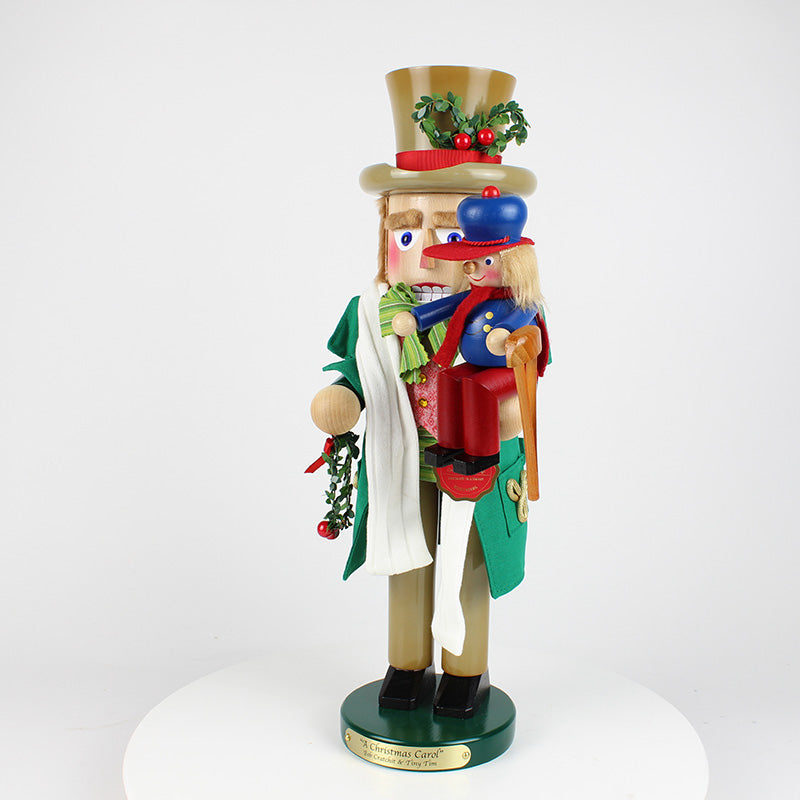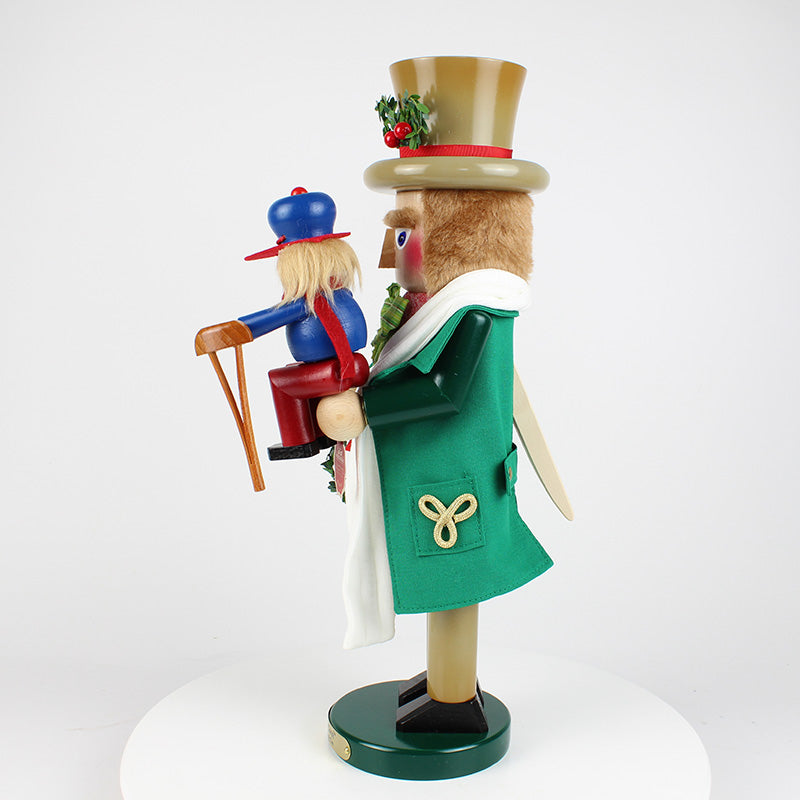 The second in the Christmas Carol Series, this 17-inch Steinbach Bob Cratchit with Tiny Tim Nutcracker is a limited edition item of 7,500 pieces. The poor-yet-happy Bob Cratchit, dressed in a green coat and a tan top hat and pants, is not only carrying home festive Christmas wreaths, he is carrying his most precious cargo, his sickly son Tiny Tim, perched on his shoulder. Though they do not have much, these two characters are the epitome of Christmas spirit, cheer, and warmth--and it is clearly shown in this beautiful nutcracker. Bob Cratchit with Tiny Tim is lovingly crafted in Germany with the finest care and attention to detail.