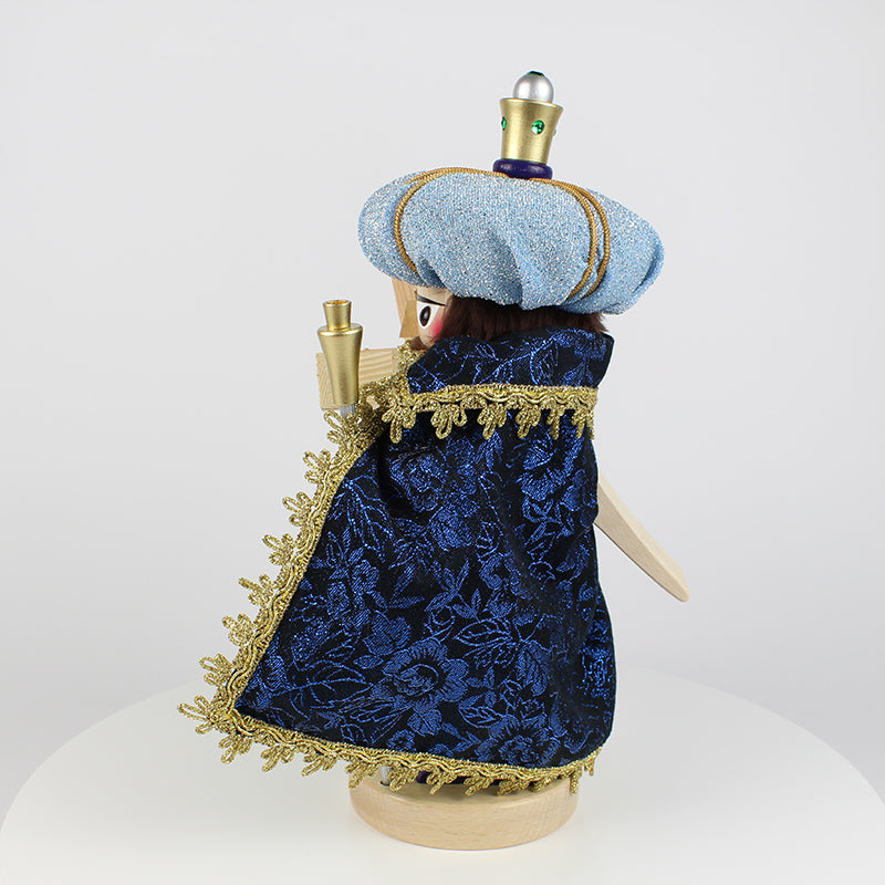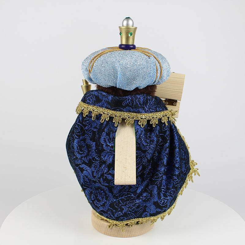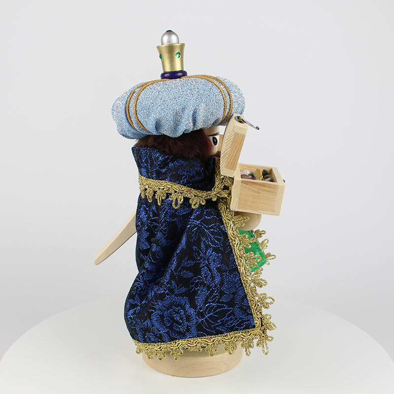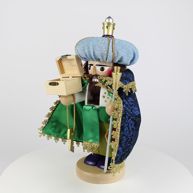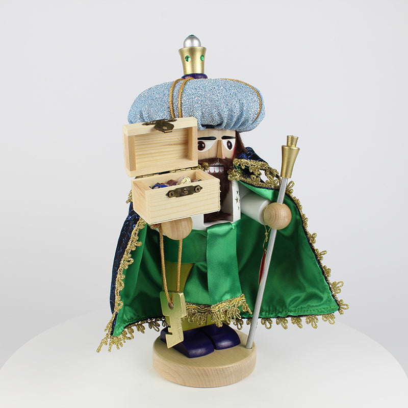 Our Chubby Caspar Nutcracker beautifully captures the spirit of this ancient tale. Dressed in resplendent royal robes, Caspar’s tall light blue turban, adorned with golden appliqués, and his flowing green cape accented with shimmering gold, evoke the grandeur of his royal status. Every detail, from the delicate folds of his cape to the regal box of gold he carries, tells the story of Caspar’s deep reverence for the Christ child. His steadfast expression reflects the determination of a king who journeyed across the world to bring forth his offering.