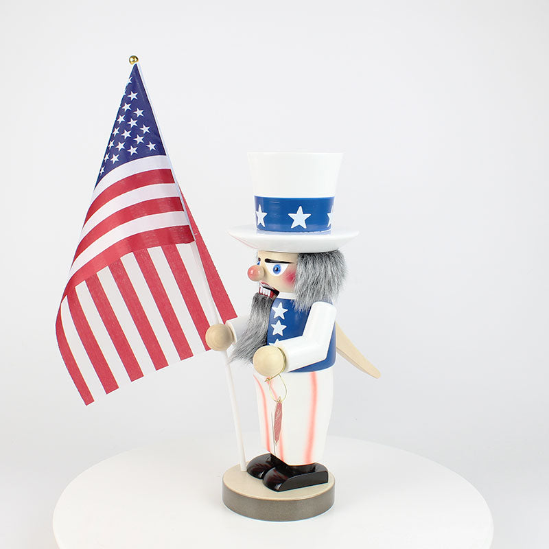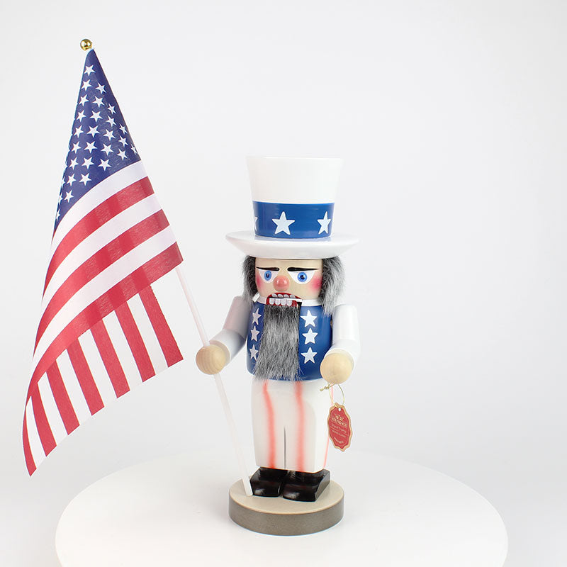 Our Chubby Uncle Sam Nutcracker captures this legendary figure in all his glory. Dressed in the unmistakable national colors, he wears a dark blue jacket adorned with white stars, mirroring the design of his top hat. His red and white striped trousers add a bold contrast, reflecting the American flag's stripes, which he proudly holds aloft in one hand. Every detail, from the serious expression on his face to the meticulously crafted clothing, pays homage to the enduring symbol of American freedom and independence.