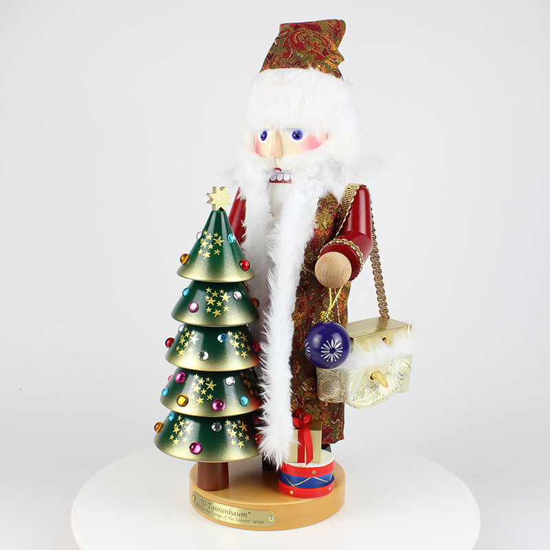 Our "O Tannenbaum" Musical Santa Nutcracker is the first in the new 'Songs of the Season'-Series. Santa Claus is featured here standing next to a beautifully decorated Christmas tree and holding a small blue ornament. When wound up, this piece plays the tune "O Tannenbaum." Like all our creations, this piece is hand crafted in Germany with the finest care and attention to detail.