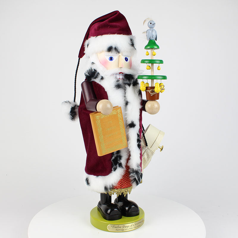 Part 1 in the Steinbach Twelve Days of Christmas Series, this 17.5-inch "Pear Tree Santa" Nutcracker is a limited edition item of 5,000 pieces, and is also musical, playing the tune "The Twelve Days of Christmas." This Santa is dressed in the classic red and white Santa suit, trimmed on the bottom with gold, and, true to the song, is holding a pear tree topped with a tiny partridge. He is also holding a golden gift bag, and a book that says "The Twelve Days of Christmas." Intricately crafted in Germany with the finest attention to detail.