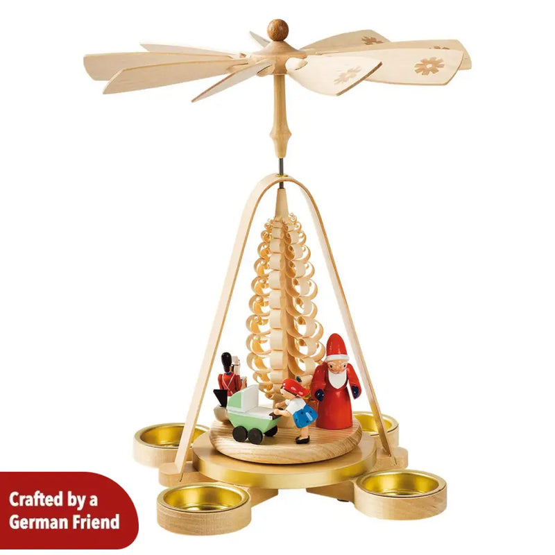 Celebrate the joyful spirit of Christmas with this charming Richard Glässer Christmas Pyramid, handcrafted in the Ore Mountains from natural wood. This lovingly detailed pyramid features Santa Claus and cheerful children with toys gathered around a beautifully turned tree, capturing the magic of Christmas Eve in a timeless scene.