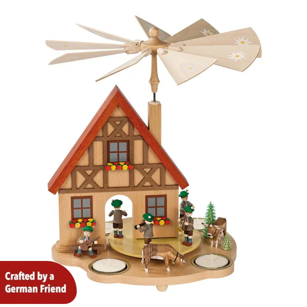 In front of the house, finely carved and hand-painted figures come to life: Bavarian musicians dressed in traditional costumes play cheerful tunes, while cows and goats graze peacefully by the pine trees. As the four tealights are lit, the rising heat gently turns the 9.84-inch wooden fan, setting the entire platform in soothing motion and filling your home with the comforting glow of candlelight. This pyramid stands 11.42 inches tall and is handcrafted from high-quality wood in Glässer’s own Seiffen workshop. It includes four tealight holders.