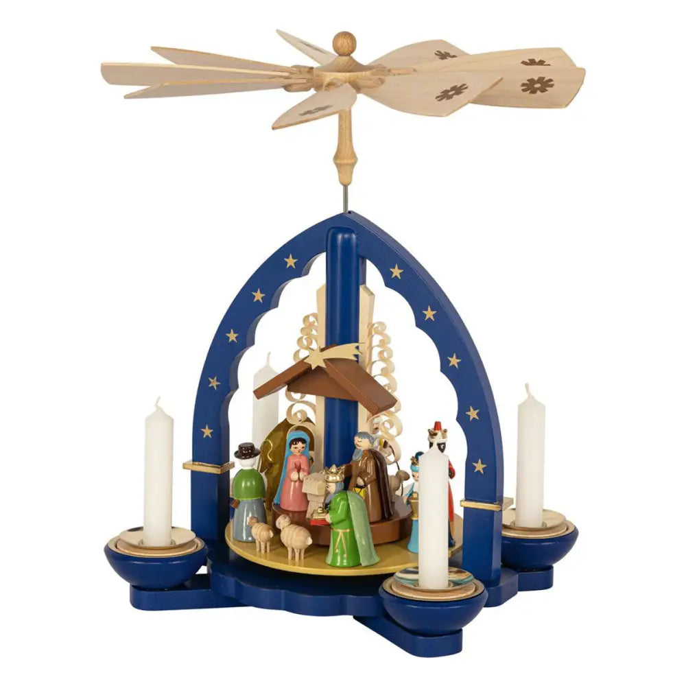 Bring the peaceful glow of Christmas into your home with this beautifully handcrafted Christmas Pyramid from Richard Glässer. This stunning pyramid features a colorful nativity scene under a graceful blue arch adorned with golden stars, capturing the wonder of the season in every detail. Delicately carved and hand-painted figures of Mary, Joseph, the Baby Jesus, the Three Wise Men, shepherds, and gentle sheep gather around the stable, creating a warm and joyful scene to cherish throughout the Advent season.