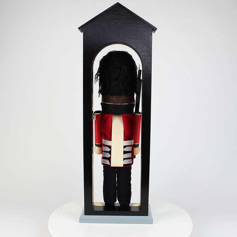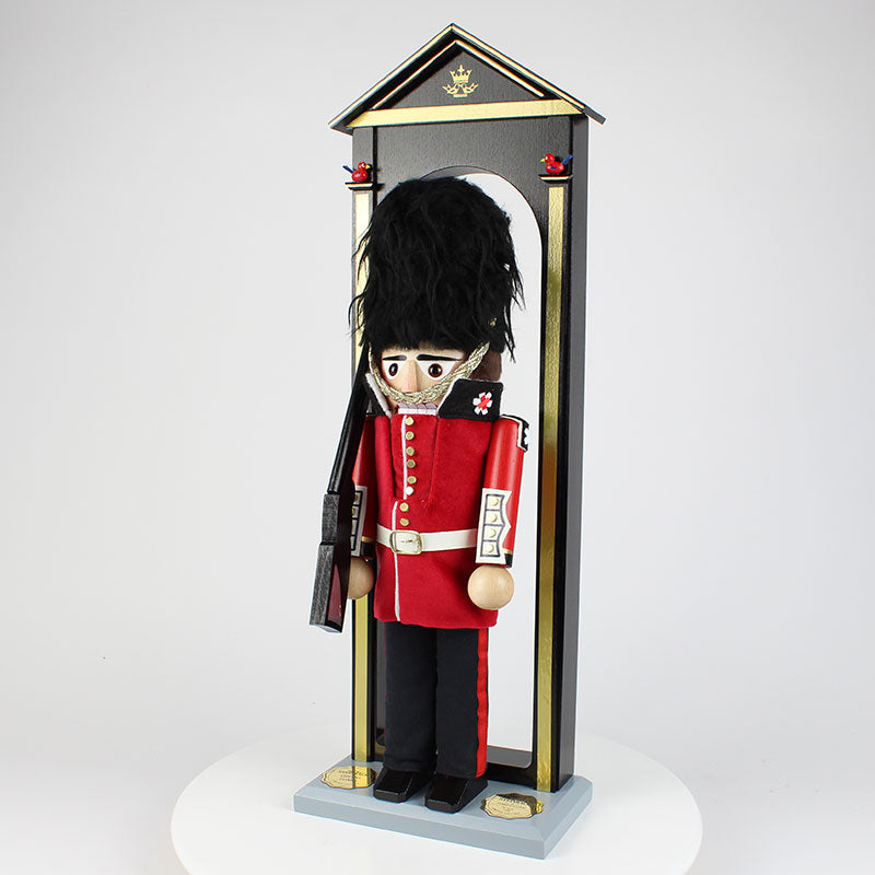 When visiting London, a walk along the Buckingham Palace is a must. The official residence of Queen Elizabeth II is secured by the world-famous guards. And so our Queens Guard can soon provide the living rooms outside of England with security. Lovingly hand-crafted, of every little detail was taken care of in the production: from the typical high helmet with fur cover over the high-quality outfit to the weapon in his right hand. The typical red and black clothing is rounded off by the numerous white and gold details and is in no way inferior to the original from London. The guard is positioned in front of a hand-painted gate with Steinbach logo and small company mascot birds, which sit on the two side pillars of the gate. This Limited Edition may not be missing in any Steinbach collection. 100% handmade "Made in Germany".
