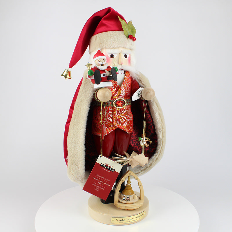 "SANTA COMES AROUND - Part 3" is the third item of the "SANTA COMES AROUND" series and impresses with its detailed implementation, extremely high-quality workmanship and carefully selected accessories. While Santa, dressed in an immaculately fashionable outfit, was made by Steinbach himself, he has a beautiful Teddy bear made by Steiff in his gift bag.