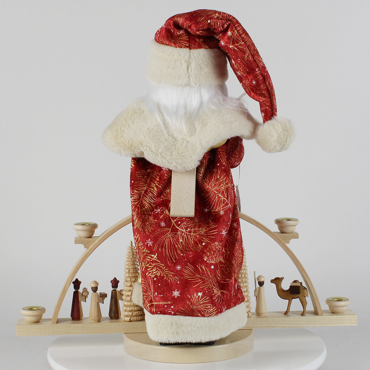 Dressed in a richly detailed burgundy robe and holding glowing candles in each hand, Santa stands behind the arch, watching over the peaceful scene with joy and reverence. He reminds us that the holidays are about celebrating what is truly meaningful: togetherness, heritage, and the magic of handcraft.