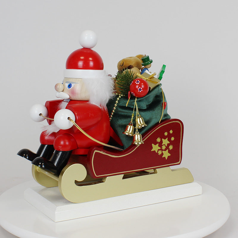 Introducing our extraordinary Nutcracker Santa ensemble. Picture Santa, seated on his sleigh, leading a team of eight enchanting reindeer to spread joy to homes far and wide. Accompanied by a sack brimming with holiday delights, this whimsical scene stretches just under a meter, creating a captivating and festive display.
