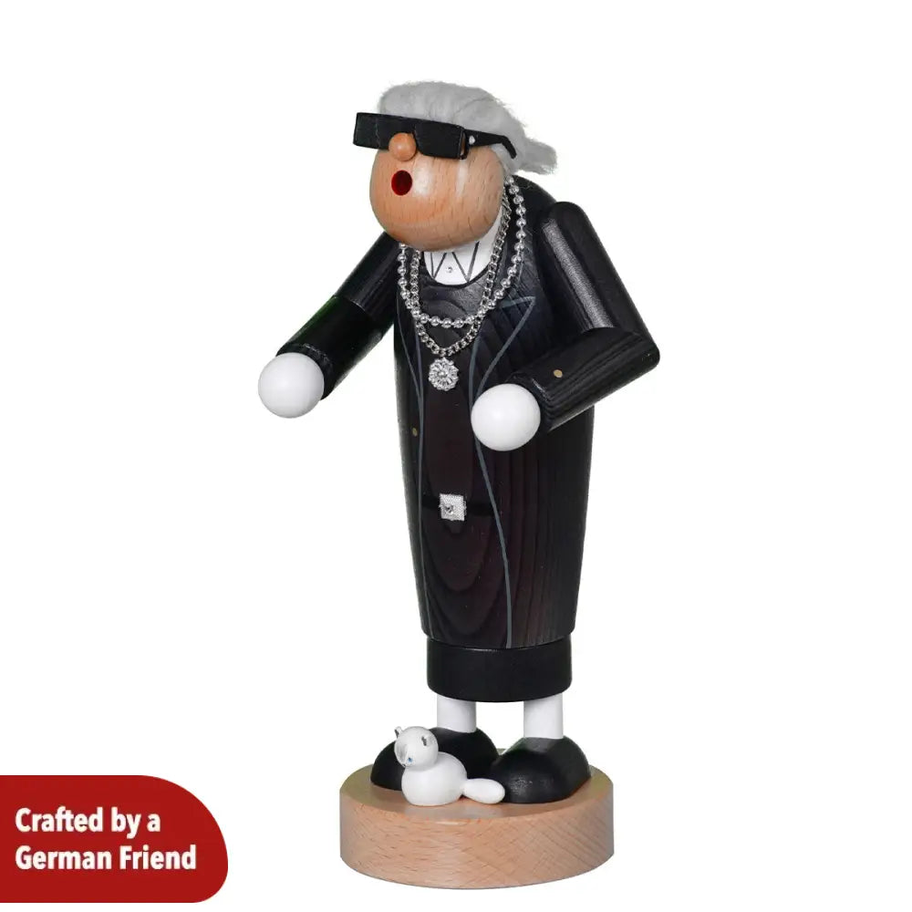 A small, charming detail at his feet is a white cat – a nod to a true fashion icon's beloved companion. The Iconic Designer brings an air of haute couture to any collection, making it the perfect piece for fashion enthusiasts and admirers of refined craftsmanship.