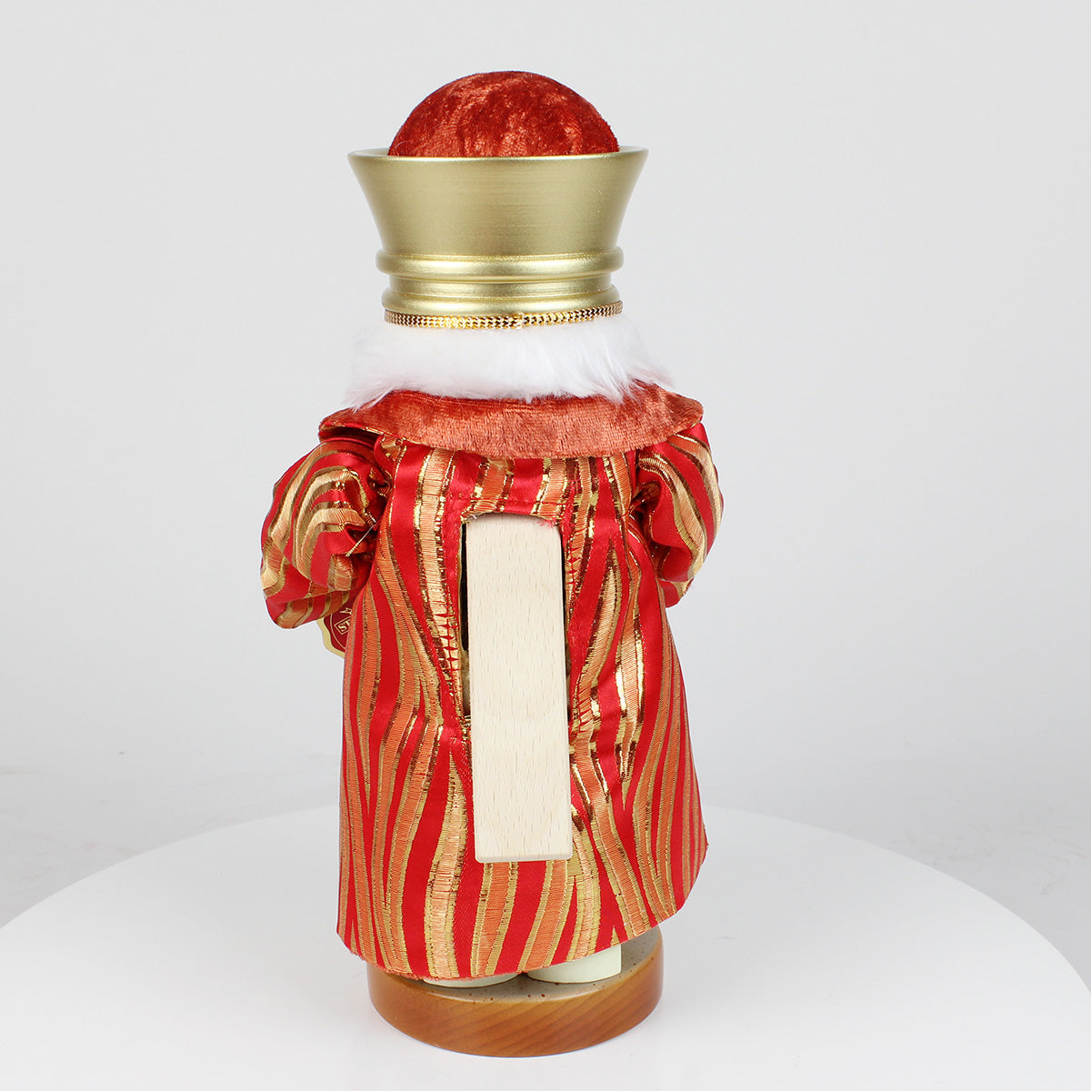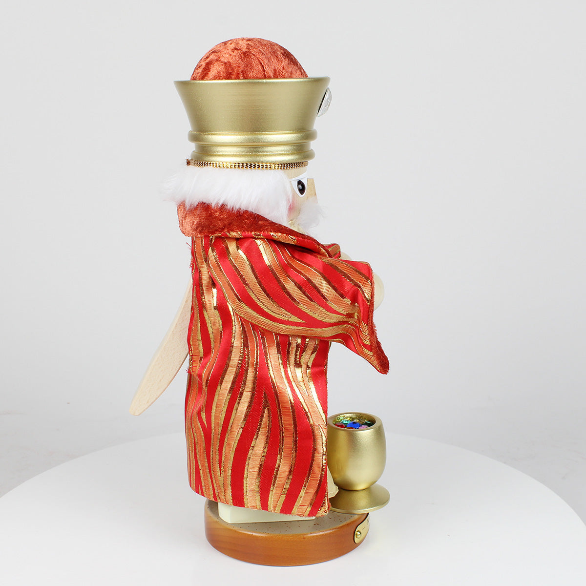 Our Chubby Melchior Nutcracker offers a delightful, compact version of our popular larger Melchior Nutcracker. He dons a shimmering silver costume, complemented by a vibrant green coat adorned with a contemporary silver and gold pattern. The hem of his outfit is enhanced with a striking silver and black design, adding to his lavish and exotic appearance. This unique aesthetic makes him a standout piece for any holiday display. At his feet rests a golden urn, symbolizing the gift he brings to the infant Jesus.