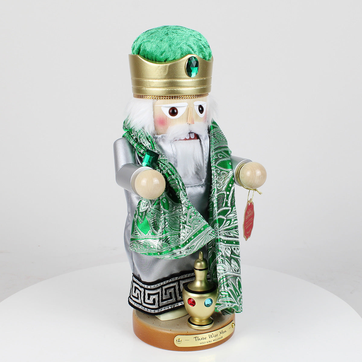 Our Chubby Caspar Nutcracker offers a charming, compact version of our popular larger Caspar Nutcracker. He wears a regal golden garment paired with an elegant orange velvet coat. His outfit features a subtle pattern, harmonizing with the attire of the other wise men. The coat is adorned with a golden design that perfectly complements Caspar's noble look. This lavish and exotic appearance makes him a guaranteed eye-catcher for your holiday decor. At his feet rests a golden urn, representing the gift he brings to the newborn Jesus.