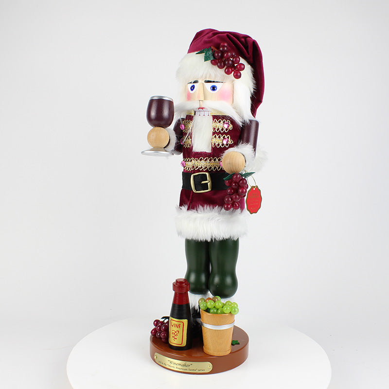 This 18.25 inch Winemaker nutcracker is the perfect item for any fall festival or wine lovers. Holding a glass of red wine and grapes in his hand the Winemaker is standing behind a bottle and barrel of wine decorated with grapes. Like all of our creations, the Winemaker nutcracker is 100% handcrafted in the Ore Mountains with the finest care and attention to detail.
