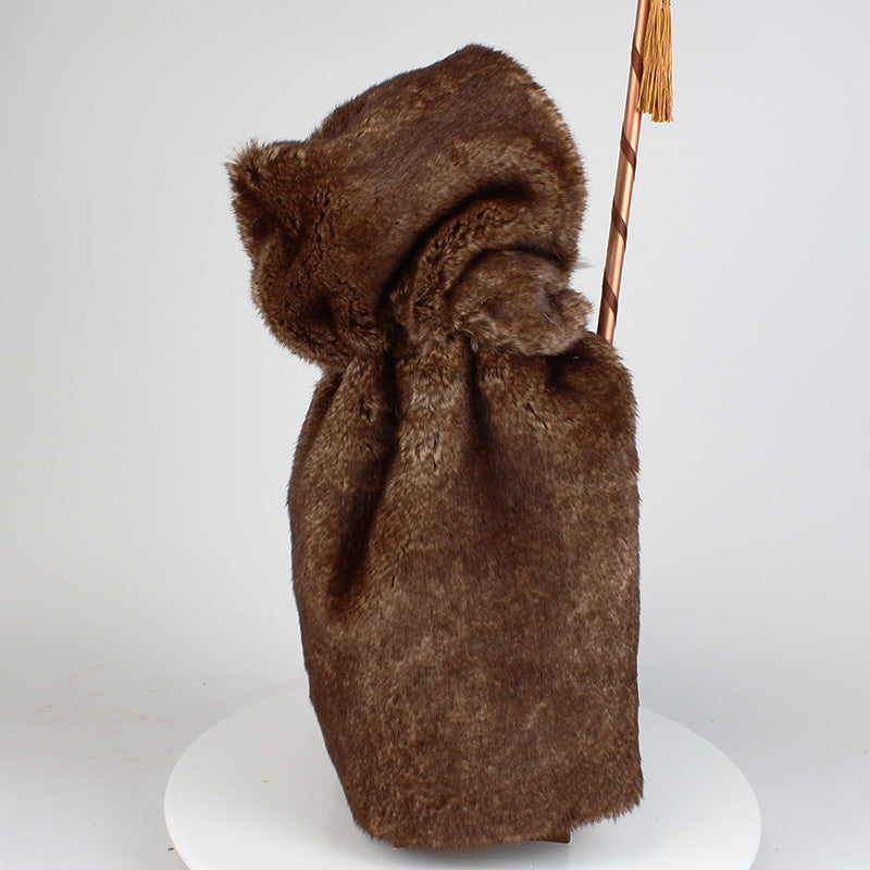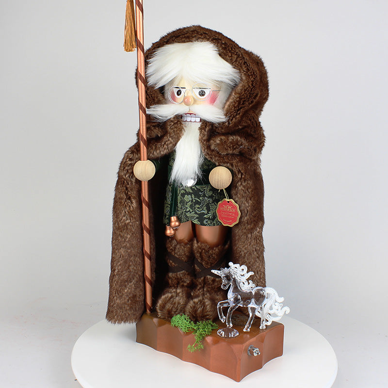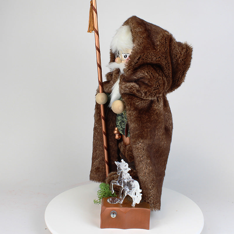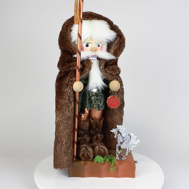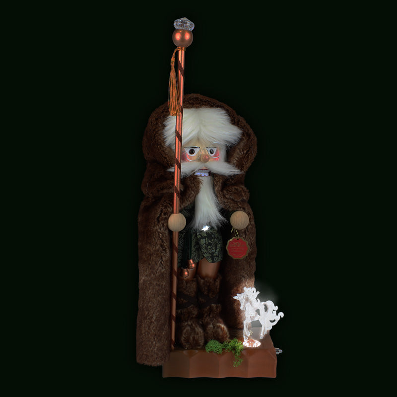 With his big brown fur coat and shoes, as well as his green vest, he seems to blend in perfectly with nature. Maybe you can find out why the wizard stayed in the woods for so long.