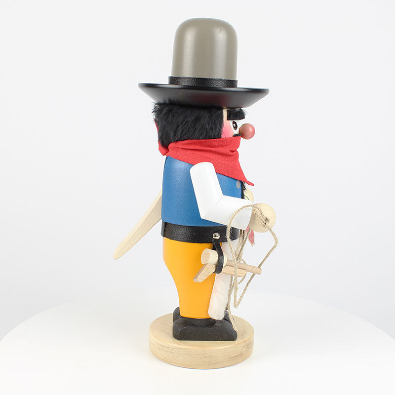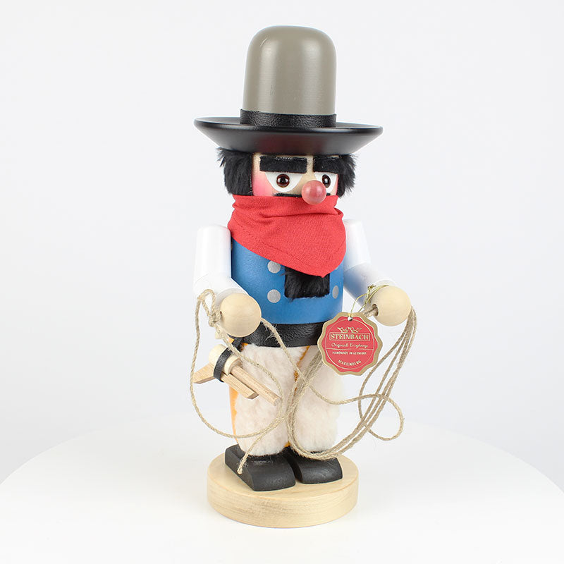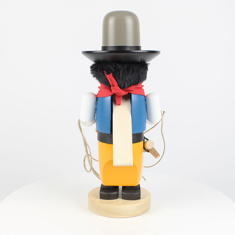 Wild Wild West! Lonely mountain landscapes or wide prairies, grazing cows, Indians on the prowl and cowboys on horses - so the Wild West of America is often shown in films! In reality, the work of a cowboy was a hard physical activity, leaving little room for debauchery. Our Cubby Nutcracker "Cowboy" is 12" tall and wears his black cowboy hat, a red scarf, whiet thick cowboy boots and a blue cowboy jacket. His equipment a lasso to catch the cattle. Handcrafted in Germany with love and care - by Steinbach!