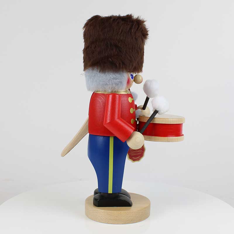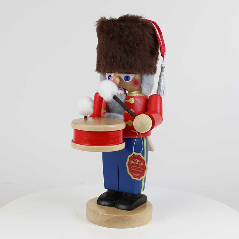 Our Chubby Drummer Nutcracker captures the essence of this iconic story with meticulous craftsmanship and a sense of wonder. Dressed in a striking red and gold uniform, reminiscent of a royal drummer, and topped with a grand hat, he stands proudly, his drum held high as a symbol of joy and celebration. Each detail, from the exquisite red tone of his uniform to the carefully hand-painted drum, reflects the artistry and dedication of the Erzgebirge region, where tradition and craftsmanship thrive.